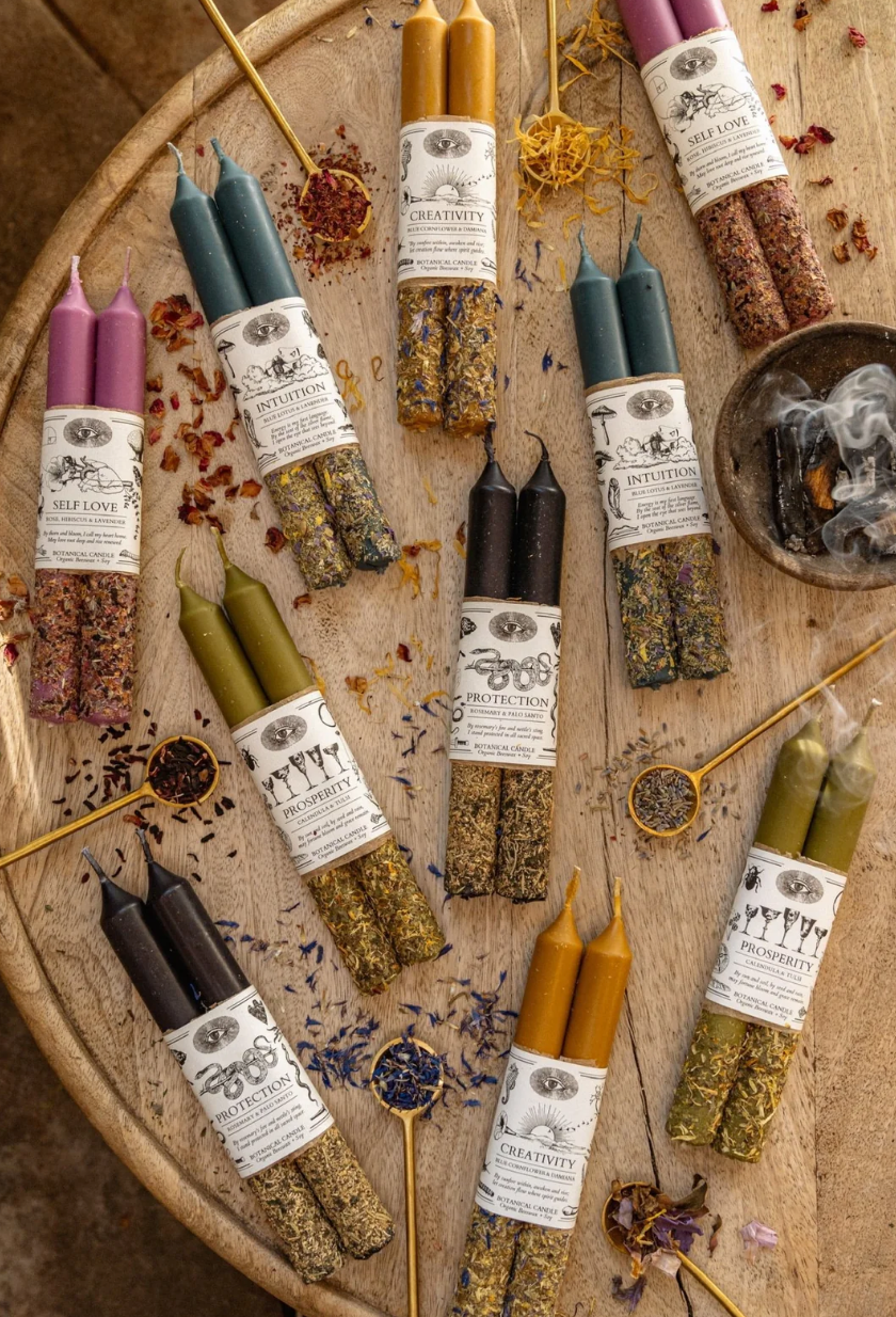 These candles are made to honor the elements and embody the sacred act of ritual—each one carrying its own incantation and energy for protection, creativity, love, intuition, and prosperity.